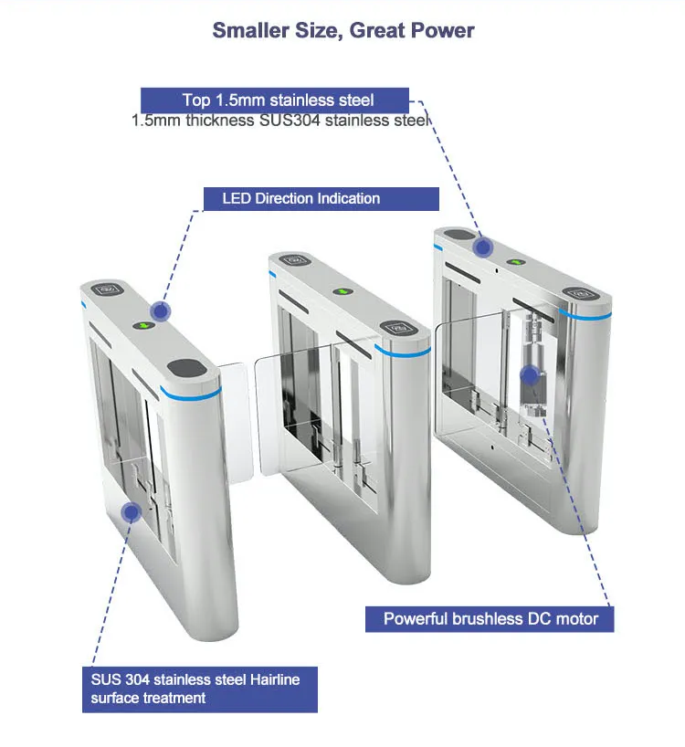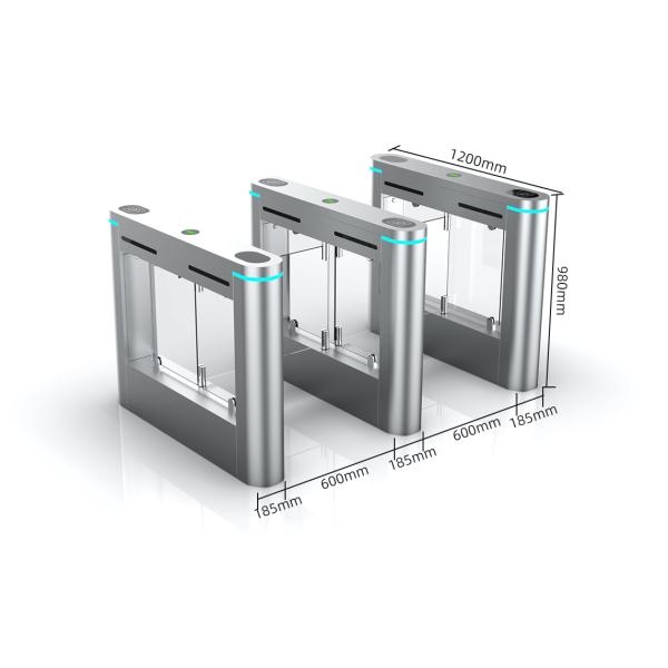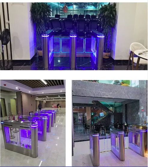 5, This swing barrier gate turnstile has audible and visual alarm. When the gate is in the standby state, the LED is blue; when people pass through the gate, it is green; and when people try to enter the gate passage without permission, the LED turns red and the buzzer in the gate beeps to alert people to the authorization violation.